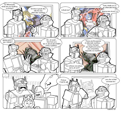 And Starscream died because he couldn't get a bomb out of his eye. SERIOUSLY? I would have loved it if "well, he's dead" had been followed by Starscream's spark sort of floating out and posessing a random car, and getting revenge...