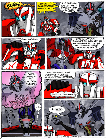 I'm starting to feel bad for KO right now. With Starscream and Breakdown gone, he's becoming Megatron's/Fate's new whipping boy, so it's only a matter of time before he winds up dead.But he's an evil unrepentant jerk, so he kind of deserves it. Don't deny it just because KO is the sexiest robot to ever do robot things sexily.