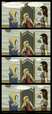 -...А, это ты. Чего? ЗАЩИЩАТЬ ТЕБЯ?? Как с головой, все в порядке? У меня десять тысяч последователей на шее висят! И к тому же я еще не окончила шахматную партию с Хаскиллом. Правда, если будешь пробегать мимо святилища Шеогората, можешь заглянуть ко мне. Я передам тебе зубную щетку и расческу. Только не используй для ритуала Призыва несвежий латук, а то вместо ушей у тебя вырастут луковицы. Бугага.