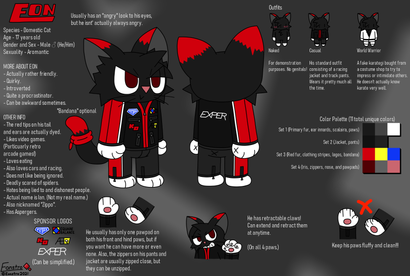 Eon's a cat who loves video games, listening to music, and cars. He's also the kind of guy who procrastinates a bit too much and is a bit careless.