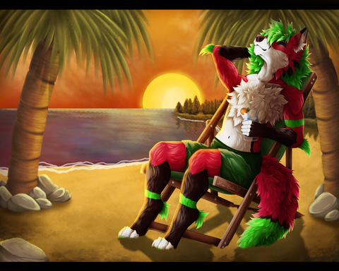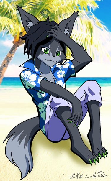 #beach #originalcharacter #digitalart #digitalpainting #dog #canine #character #eyes #female #fox #furry #glowing #horns #kimono #leaves #palm #shadows #tree #trees #wolf