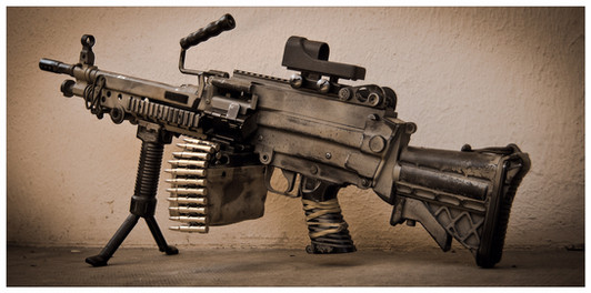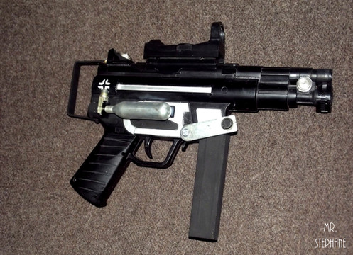 Airsoft Replica. Work In Progress.Springfield Armory custom .45, with Simonich/Strider "Gunner Grips" replica, front sight Trijicon w/tritium, match grade style polished barrel bushing & Surefire Classic 310 replica.