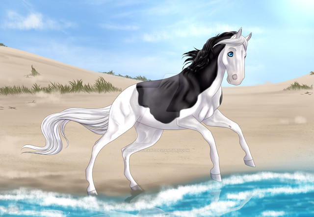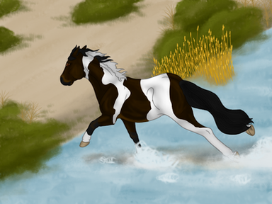 I really love the water, how the ripples look, along with the epic pose and the pretty paint pattern. The mane and tail look so pretty, too, all flowing. I like the simple background. You don't need a huge elaborate one because all of your attention is drawn to the horse. I think it turned out fantastic, Dana! WONDERFUL job on this!