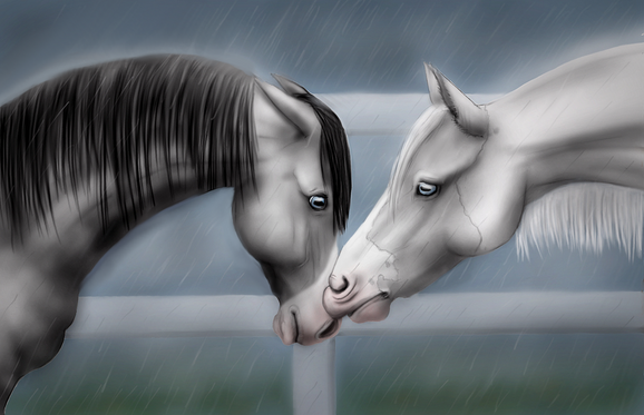 The willow tree shook with the ground as the thunder shattered through the valley, and the two horses stood close together in the pummeling rain...