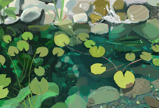 A quick study of a water feature. Trying to paint using mostly solid opaque colors and limited brushes.Related content