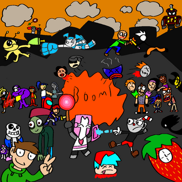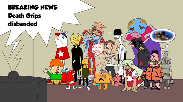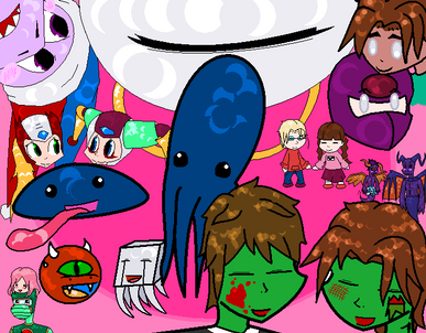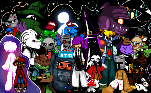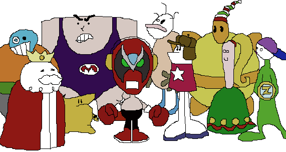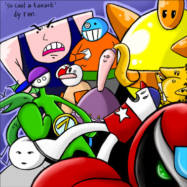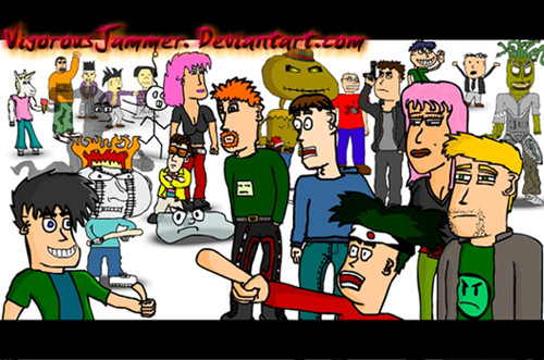 Anyway, aboot the arteests. I did this with . On iscribble. With spirit. Spink drew up Brad, Mr. Malice, Craig, Rygar, Stomach King, Evil, One of the Tandies, Joel, and that's it. Moi did the rest, and the background.