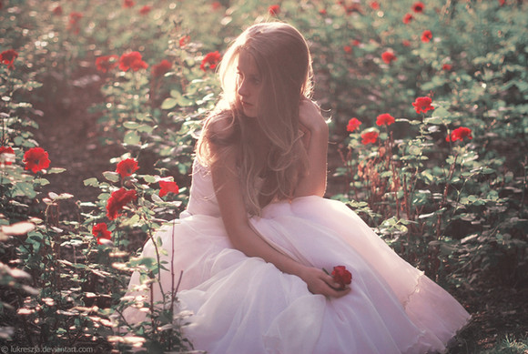 Beautiful shot! I love the lighting and colour contrast of the red roses with the green and the model's dress, the model herself is gorgeous looking and that light that hits her hair is very peaceful.