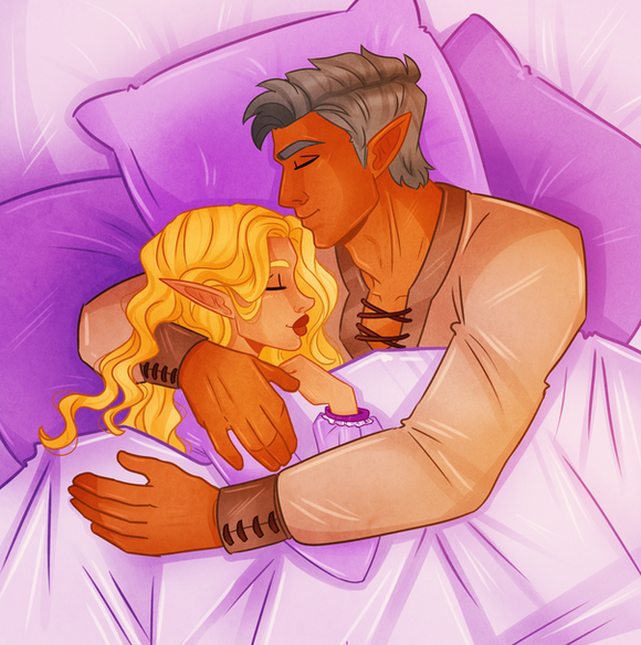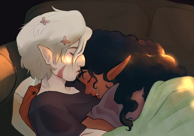 Like I mentioned, I have lots of art from the last weeks (or, in some cases, months) piled up that I'm planning to post over the next few days. This is one of the oldest pieces of the bunch.It's Willow (surprise) and Okrin, his best friend and party member, sleeping peacefully in the pillow fort they built (yes, they're essentially 5-year-olds). They've met less than a week ago (we've been playing for over half a year but in game only a few days have passed... lol) and already are best friends for life, it's adorable. They're both naive and playful and kindhearted.... and not very bright (we're talking 6 Intelligence in Okrin's case). I love their dynamic and their ridiculous antics. Also, Okrin has saved Willow's life more than once which both Willow and I are super grateful for.