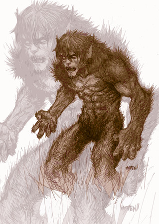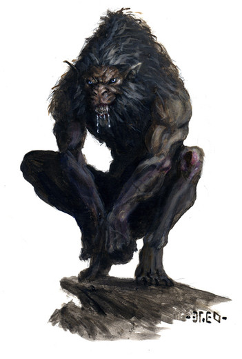 creature from Inuit mythology: [link]the one description I read was a vampiric half man half canine.