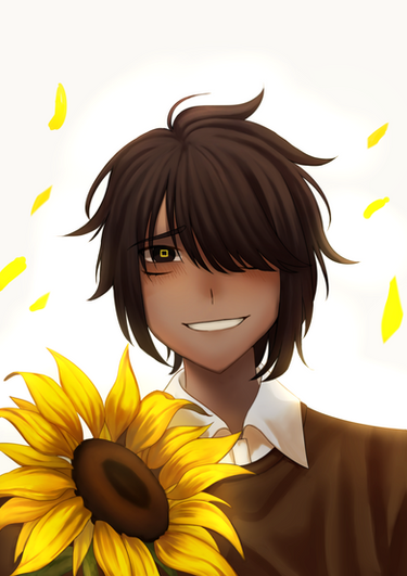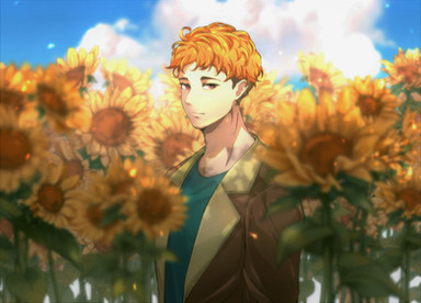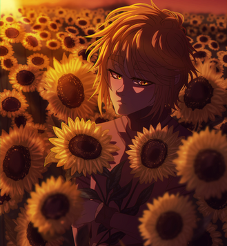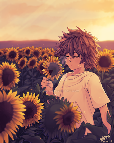 Woah man this came out wonderful, I loved the version I saw on Twitter and I love this one as well. Gah I love sunflowers...all the lovely sunflowers and the beautiful blue sky...it is so serene and relaxing...ahh and he looks so pretty and peaceful....like an ANGEL xDDD *gets slapped* I LOVE THIS TOO MUCH okay
