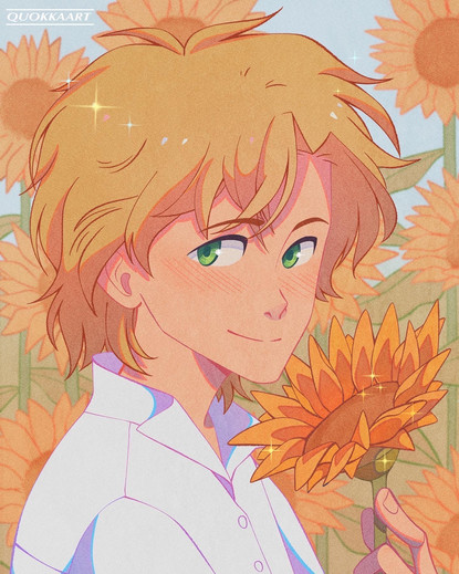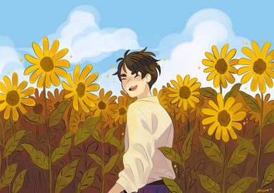 The colours here are really good and fits the summer vibe so much! I love the subtle green, orange and purple here and there too! And also all the details you put in this drawing! Such as the airplane's contrail in the sky, the subtle textures, the almighty dust dots and also your forever gorgeous painting technique <333 (I have to say I REALLY LOVE HOW YOU RENDERED THAT SUN FLOWER THAT HE'S HOLDING! It has so much shading inside, I would never thought of painting sun flower like this!! such beaut )