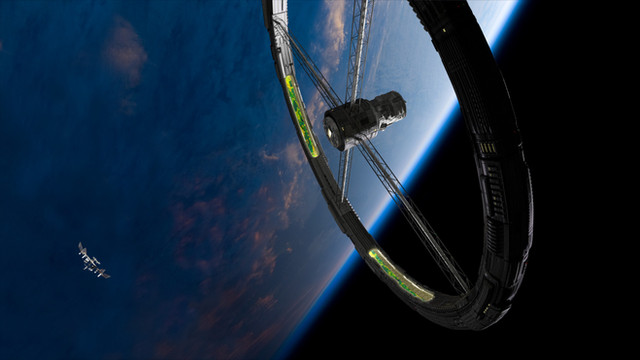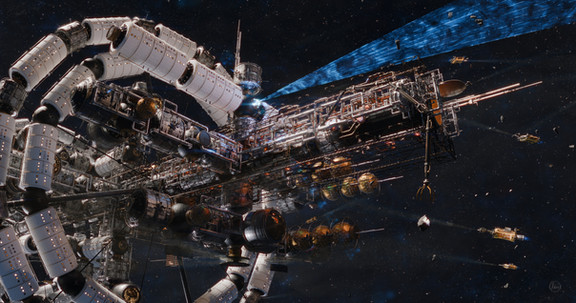 Как всегда технический вопрос - малые "бублики" (на "кольцо" они несколько не тянут по пропорциям ) вращаются, или закреплены статично? Вопрос не совсем праздный, потому что наличествует явная обитаемая центрифуга, но на глаз не видно объекта, который мог бы вращаться в обратную сторону, противодействуя эффекту гироскопа.