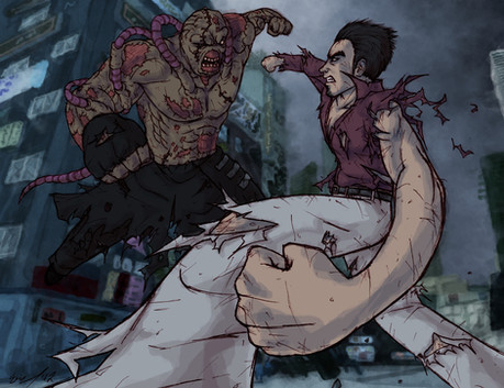 I was given a description for these characters/the scene, so instead of drawing a generic fight scene that I could pretty much swap in virtually any characters, I tried to set this up specifically for these characters.