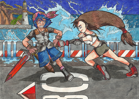 Aeris' pose caused some trouble too. I was bent on making it dynamic and I was satisfied with it. But in focusing on making it dynamic, I overlooked that the posing of her legs may not even make sense. Like the amount of foreshortening suggested a distance between them that wouldn't be possible with the posing of them. Of course, I didn't notice this until after I scanned the lines, and I had to try and fix it on the computer. I could only do so much by that point though, so it still may be stretching it a bit much.