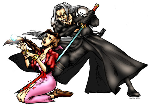 Β I see what you mean with the poses, and the legs in general. However I still think this is pretty sweet all around. Still love Aeris' pose. It's like.. the staff is being wielded like a bat and Seph's gonna get his face smashed in. XD Hell she looks like she might throw the damn thing.