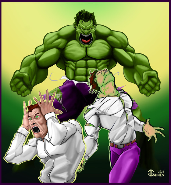 You did it. I mean, it's perfect, really. Most would have panels of the transition, but splitting him in half was logical. Prefect for animation and it leaves room for each limb to "Hulk out" in sequence.