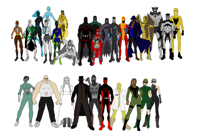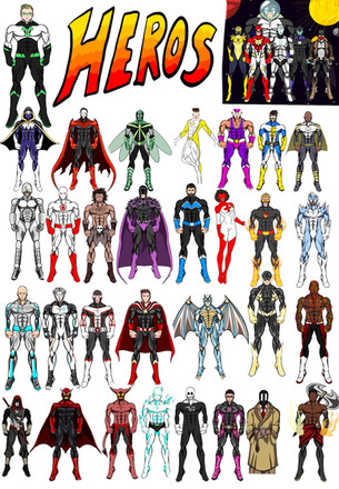 Love creating new original characters! Just came across 5 sheets I never scanned in of various male-looking heroes and baddies for the Leading Edge "Angelverse"! These are the results from three of them. Generally I create a very light template of an average hero-body, one for males, one for females, and start drawing over the faintly printed figures, fabricating "looks" and knowing the physiognomy can be altered later (if the OC needs to be skinnier, more top-brawny, more alien, etc.). Great for getting a first rough look at new characters! Then, after loading them into PS, the color applications can dramatically affect the vibe of a character. Throw out green, use red, add black, no white, and so forth. I don't color the ones I later judge to suck despite my best efforts to revise. Sometimes you gotta know when to quit! Hah! You finally are left with quite a line up! I will definitely assign names and powers (already have for some) to many of these newbies. Sky's the limit, yo! The good news is, I also found several sheets of babes as well! More to come! Gonna be busy this week! lol!How do you guys go about creating new characters, new looks?