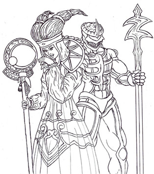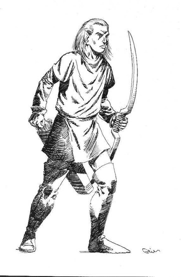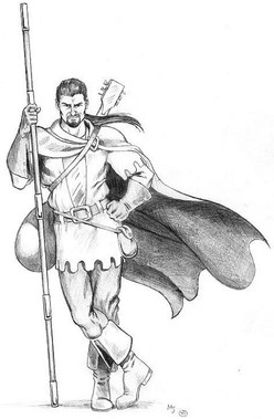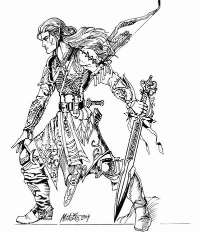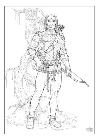 I don’t have this guy as developed as I would like. So far I know what his personality is when compared with Astrid. He’s the more serious and straight-laced of the pair, he really didn’t want to be a mercenary especially working with someone he considers rather silly, but some bad circumstances left him short on options. He’s been in the army and he’s been a ranger sort of character since then until his mercenary stint. He has magic of the earth and wood varieties, which worked out pretty well for the ranger gig and serve as a contrast to Astrid’s wind magic given super speed. Earth magic grants him far above usual strength and wood magic lets him telepathically control certain wooden objects, especially those he carved himself so he’s able to use a bow of immense power.I have some issues with making designs for this setting and I‘m really not sure that scaly armor is going to stay. A feature of the world is that it’s actually quite resource poor, there is not nearly the metal or fossil fuels that the real earth has. There’s a plot related reason for it, but I’m not sure I want to give that away up front. It has the effect that most people improvise other ways of doing things, buckles of metal are somewhat rare, most people with metal weapons have already proven they have noteworthy proficiency and a full set of armor in metal is just an outlandish display of wealth. There are a number of formidable creatures running around the setting though, so I thought I might take some design tips from the Monster Hunter games when people use the rough hides and scales of creatures to make armor and weapons. The idea behind his arm and leg armors are that they’re some creature’s hard scales somehow affixed to leather sleeves which slide over the limbs or boots and then are strung tighter. They’re more for protection from harsh terrain than combat, but they are solid enough that they can be used in combat situations, but it requires substantial maintenance and are not considered to be high end armor.