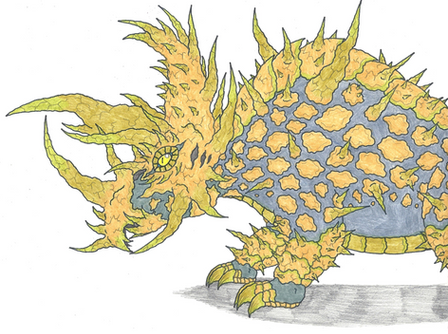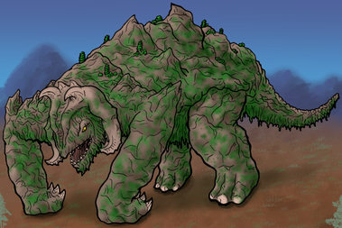 An herbivorous species from the setting's rift lowlands, the species rarely has contact with the indigenous humans of the setting who inhabit the highlands. When erosion causes highland territory to collapse in such a way that the difference in elevation becomes more gradual is about the only time that high land inhabitants and lowland inhabitants encounter each other. The animals of the lowlands are highly dangerous but their remains are valued for materials for armor and weapons.Shelled Diggers have some affiliation with earth magic, which aids them in digging hiding holes at night. The sand that collects on their crystalline back structures can serve a defensive purpose. As a last resort the creature can superheat its gems for a moment, heating and expanding the sand and soil deposits remaining and creating a small volcanic explosion, burning enemies and creating a smokescreen. In spite of their heavy defenses, they are shy creatures and slow to provoke into attack.