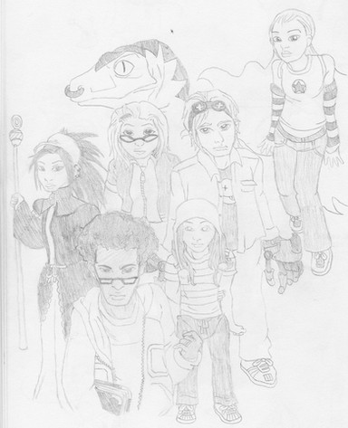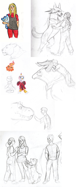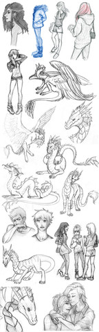 Another potential series thing maybe... so this is a rather weird initial sketch job on a possible monster story kinda thing maybe. The sketches that worked out worst were left non-inked, or had a picture moved over them.Since I'm trying to make them for something a little more serious than my norm I was trying to avoid some of my conventions with this one, avoiding prominent eyelashes on the girls, trying to keep the hair tamed and not so excessively voluminous, which was harder to refrain from than the eyelashes... I just know when I show this to friends they're going to say the gals look like somewhat effeminate young boys... bah, they all think I draw girls kinda butch-looking all the time anyway. I'm not sure if I'm annoyed at them for having very specific standards or my own failings as an artist at depicting any kind of range in style. The dragons are all very preliminary, I hope to make them actually interesting by the time I've finished with them...