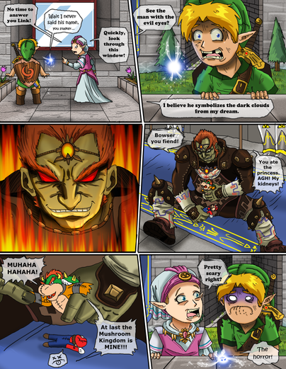 That is kind of a lot. I went this way because I could obscure enough of Bowser to kind of look like beast Ganon, I also saw someone else did the Mario-finds-Zelda version.