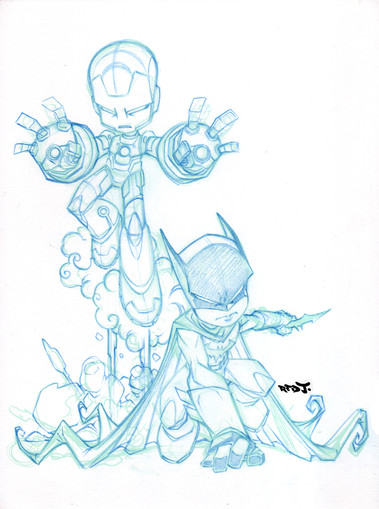 I used some art from Lord Mesa to make this sculpt. I saw that cool ass Batman version he did online and had to sculpt it up. Here you see Batboy's head roughed in a sculpey preemo mix (I mix those two for strength sometimes). I twisted up some aluminum wire to make the little body armature and used the the plumbers putty to hold those wires together and rough in where the chest and crotch would be.