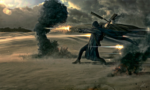 kire1987's Mortal Inquisition, an artwork produced for SlashTHREE's exhibition "Steampunk", is an astoundingly detailed artwork. Erik exhibits remarkable technique, using creative and advanced photo manipulation. It immediately draws in the viewer with a vibrant and exciting atmosphere, toned well with excellent contrast and coloring. The action of the piece is incredibly electric and smooth. Erik shows an impressive attention to promoting the artwork's depth, which is accentuated by the beautiful atmosphere and the unique perspective that Erik has chosen to use. The focal is well promoted by the details that have been intrinsically placed in Erik's artwork. I think that the seriousness of the woman's face further helps improve the mood, and fits the atmosphere appropriately; leaving more up to the viewers imagination.
