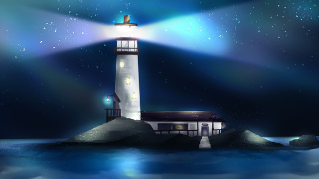 A lighthouse on a small island, close to the shore. It's connected to the mainland by a bridge.I'm going to create one or two pieces showcasing the island from different angles.