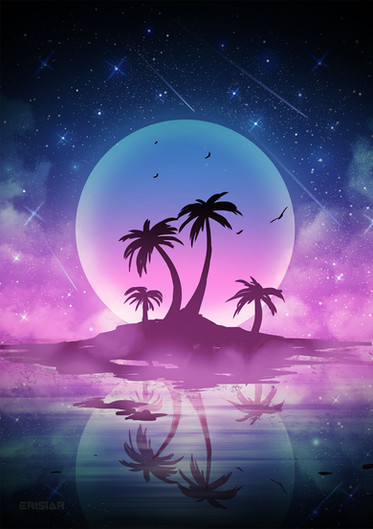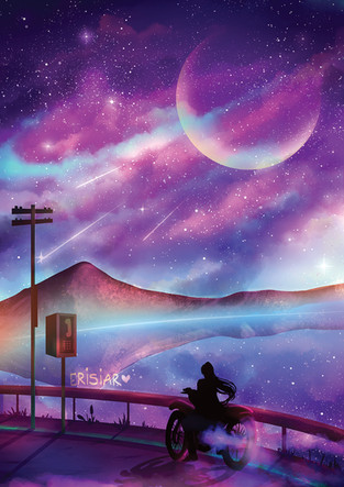 This is special. Not becaus it's pretty but because of its message. To me it speaks about how we care for each other by creating that special world for that special person, man; woman; cat; moose. The vision is clear that you understand simplicity in design. Your technique might be improvable by my intuition, just that the moon's edge is so crisp for instance, and that the star/leaves seem so perfect, along with the shooting stars. This piece looks lk it could simply be processed with a bit of muffling up, as if it weathered in some dust for a day or two. I'd blur the moon's edge by thuh slightest amount, and find ways to dirty this up a tiny amount. .__. Hav uhh gud day .~!
