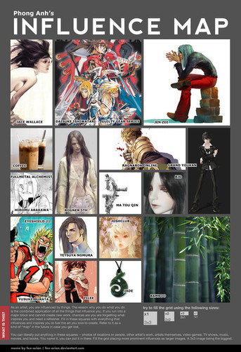 My Influence Map, it was a bit easy for me to find or recall who inspired me in arts, and you might see a clear or notice the resemblance in my drawing.Those with complete Sphere Grid are the dominant styles seen in my drawings.