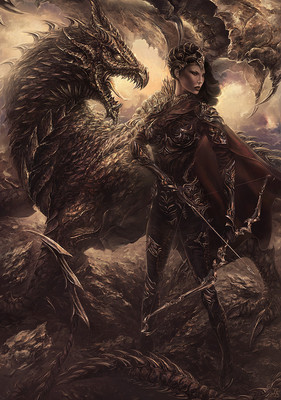 I like the similarities between her armor and the wyvern itself (sorry, dragon-nitpicky me there; dragons have six limbs, wyverns four) although I do wonder why she even bothers wearing armor, considering the amount left unprotected (she must get cold at altitude )