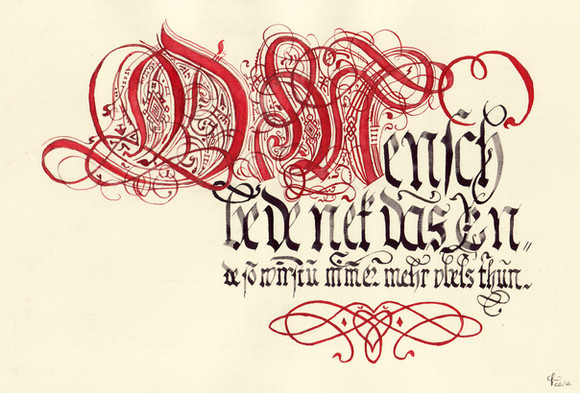 Calligraphy : Gothic Fraktur, Gothic Cursive.Ferro gallic ink, Watercolor ink, gouache.