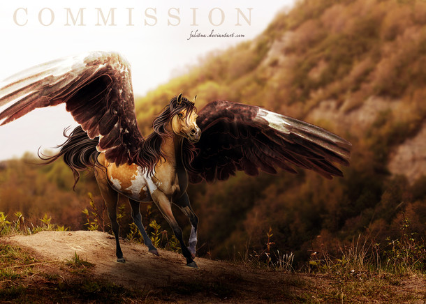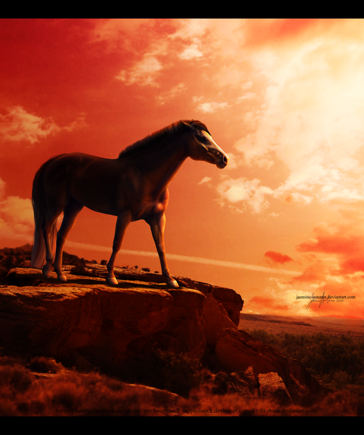Beautiful! The colours are so inviting and warm. The lighting is brilliant. And the changes on the horse are GORGEOUS! I would say that the line around the eagle is a bit thick and could do with a more gentle outline, like on the horse. Also the edge between the grass foreground and the moutain background is quite sharp. I would either burn or blur a tiny bit of the edge just to make it a bit softer. I love the hair colours! SO PRETTY!
