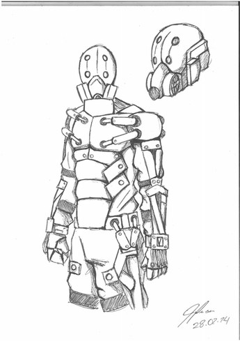 Outer layer is reinforced fabric and light steel-plates, underneath and partially visible (arms) are the artificial muscles and engine
