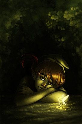 I love how it's rim lit and the characters get brighter as they move into the background. I would have probably put a hotspot in there, or put another dim light source trickling down from the trees. I think that would have given the image more depth.