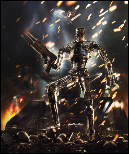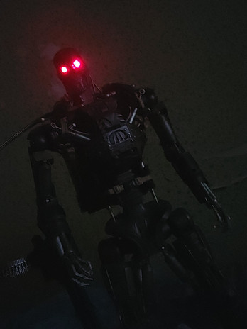 This is a picture I took for my digital photography class using a silver background, red x-mas lights and my T-800 action figure.Related content