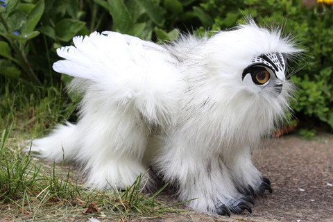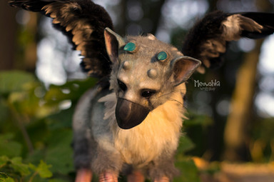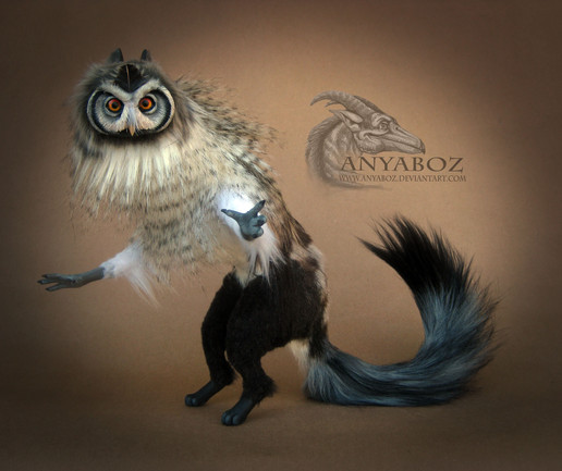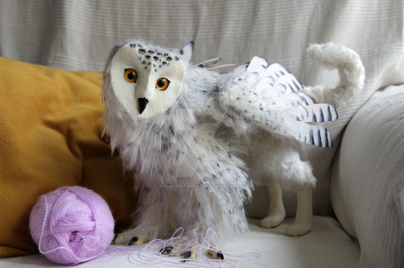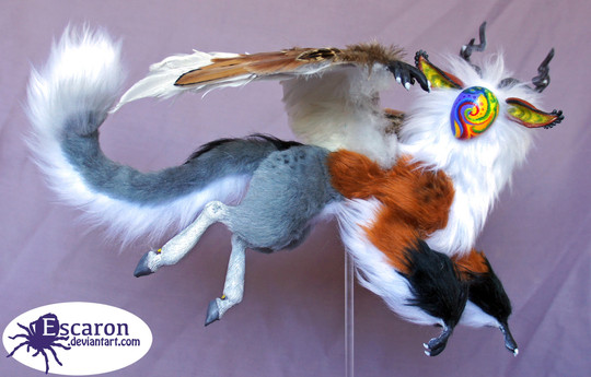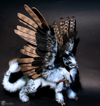 Ikes body is made of the softest fauxfur that Ive trimmed, and his wings and tail is made of real feathers. He is fully posable in arms, wings, ears and neck,and the back legs adjustable - but made for sitting and lying down, not standing. Ike is a truly unique artdoll and I will never make another like him.
