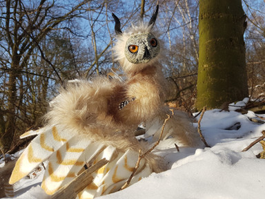 Ike the Clockwork Wizard is completely handmade, original and ooak (one of a kind). His 2 mask (faces), ears legs, and hands are sculpted with lots of care, time and details and everything is painted with small brushes and lastly sealed. His face is a pocket watch that can be opened and the handles changed. And the small watch around his neck can be winded up and is working. The 2 masks can of course also be attached to the face with a ribbon and the owl mask has real ostrich feathers attached.