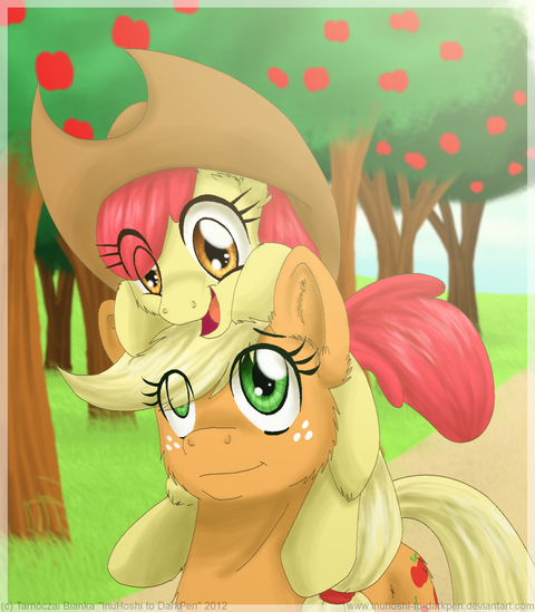 Drawing I have made for K4nK4n based on his own piece Simpler Times , picturing his ponysona Applestack with little filly Applejack. Hope I didn't messed up too much, actually feel very unconfident about these color and light and especially background.K4nK4n made a first comment I recieved on Deviantart. May be it's not a big thing, but I think it should be rewarded somehow.