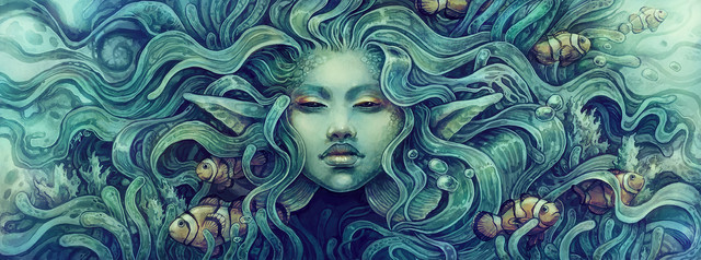 I really like the gentle, androgyne look of your mer...person, here. Between the diametrically opposed ancient Middle-Eastern and Greek traditions of the gendered sea and earth deities, this strikes a lovely balance, with a calming hint of susurrant movement as well.