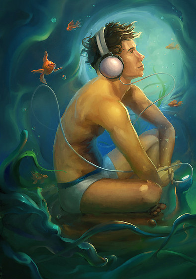 It's just that... the serenity of the image... it's all there. As if it's still caught in the tangles of anemones tickling that fish, reaching out for the boy/girl (sorry... not good at telling people's genders apart...). As if you've caught the person in that exact frame of time as their head moves around to steal a glimpse. Everything in this image feels so alive--- from the shadows, to the bubbles, and the expressions on their faces. Alive, but still, suspended in a single scenario.