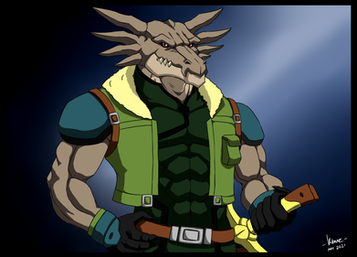 My favorite characters are actually from the 4th game and I did consider drawing them (or the game's antagonist Ryu, who is a more regularly human-looking character), but I wanted to go wild and challenge myself... and besides, in a lot of ways, Garr (pictured) has a character arc that just drives te game just as much as Ryu's. I also used a differeny brush than normal for this, and touched up the silhouette manually rather than simply expanding a selection as usual.