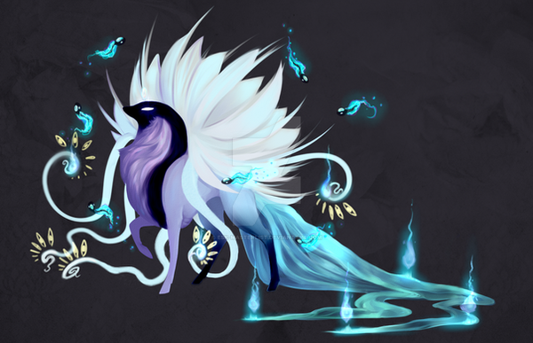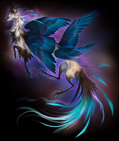 mutations multiple wings, Bioluminescence (tree branches on head), Unnatural nature feature coloration (blue Japanese knotweed)