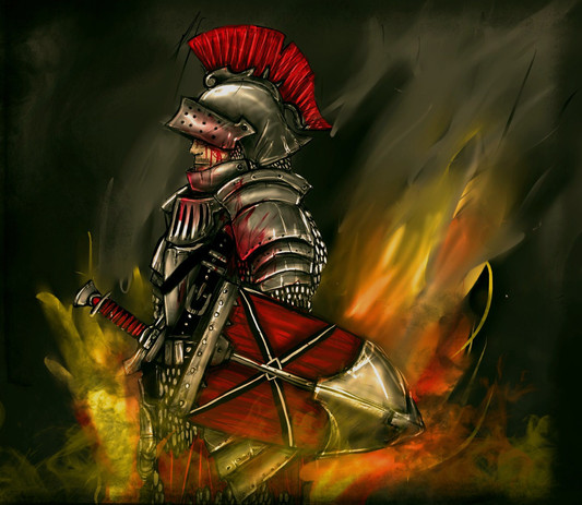 The red cape and blood sticks out so much against the monochrome background, I LOVE IT. Makes me wonder where he's marching off to so confidently!