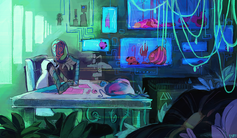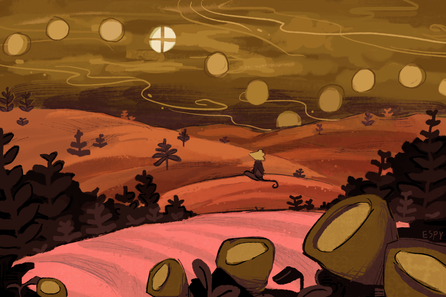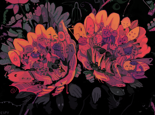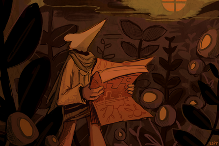 This style looks very unique and original. The overall dark tones and sketchy lines create a mysterious setting. Well done!