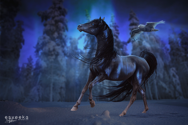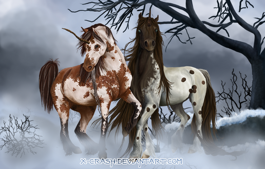 truely nice work (although i must admit that i don`t like the eyes so much, but that`s personal taste) - i very much love the pattern on the dark horse`s back, bravo, well done...