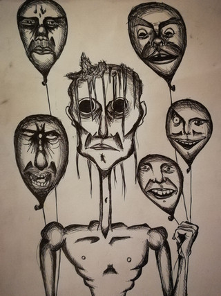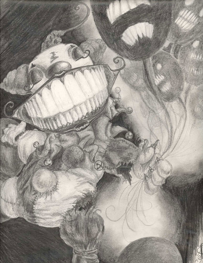 I don't know how I came up with this, but I thought of this guy holding a beer botltle, and the beer is driping out upside down and going up then turning into balloons. I decided to making him hanging out of the mouth of a scary face, kind of like "Chances Die Out"Related content