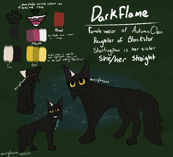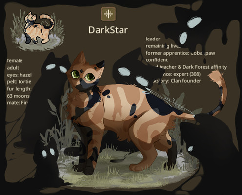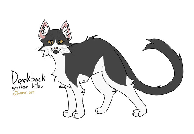 Daughter of Dugong and Colugo, Darkling is a kindhearted but anxious cat who worries deeply for those under her charge. Despite being elected to her position as leader of the ruins clowder near unanimously, she often frets that she isn’t suited for the role. She was born in the forest in the final days of StormClan, before being brought to the ruins by her fathers. The memory of those early days are foggy in her head, but her experience caring for her elders has taught her all too well that old wounds don’t fade away so easily. Determined to do right by the cats who trust her, she takes it upon herself to uncover the truth about the recent murders haunting the ruins and forests alike.This has been done for over a week yet I forgot to post it for some reason lmao