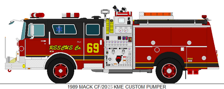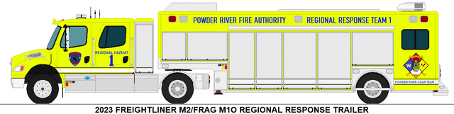 Engine 11-3 is located at Station 4 in Wyarno, Sheridan County. This enigne has a 750 gallon tank. This unit is set up with four hose beds: one with 1200' of 5" large diameter supply hose, one with 500' of 2 1/2" supply/attack hose, one with 250' of 1 3/4" attack hose preconnected to a rear discharge, and with one 200' of 2 1/2" supply/attack hose in a dead load to be pulled and used as a blitz line. In addition to its hosebeds, Engine Sixty Two also carries two 150' preconnected 1 3/4" crosslays, one 100' bumper tray line of 1 3/4" attack hose, three 10' segments of 5" hard suction hoses, one 15' segment of 5" large diameter supply hose in the engineer's compartment, two 25' rolls of 2 1/2" supply/attack hoses,one 150' high rise packs of 1 3/4" attack hose, two 150' progressive hose packs of 1" wildland attack hose, and one 300' preconnected 1" booster reel off the tailboard. Engine Sixty Two also carries two sets of forcible entry tools, one 14' roof ladder, one 24' extension ladder, one 10' attic ladder, two pike poles, one roof hook, one trash hook, two dry chemical extinguishers, one pressurized water extinguisher, one CO2 extinguisher, six spare SCBA bottles, three sets of hydrant tools, hose adapters and nozzles, one pulaski axe, one rhino tool, one combi tool, one TNT tool, one mcloud tool, one drip torch, thirty fusees, five personal fire survival shelters, one bolt cutter, three 5 gallon containers of Class A foam solution, three cases of water bottles, one box of 24 MREs, one 300' bag of life safety rope, four rolls of fire scene tape, one salvage cover, three bags of quick absorbent, one wide mouth shovel, one push broom (disassembled for transport), one bolt cutter, one K-12 saw, one chainsaw, five traffic cones, cribbing, ten road flares, gas monitoring devices, a thermal imaging camera, two long backboards, one AED, one trauma jump bag, one oxygen jump bag, one maternity jump bag, one spare M-15 oxygen cylinder, and a BLS jump bag.Engine 11-3 is staffed by up to: 1 Volunteer Engineer (First Responder/EMT/AEMT/Paramedic), 1 Volunteer Lieutenant or Volunteer Captain (First Responder/EMT/AEMT/Paramedic), and up to 4 Volunteer Firefighters (First Responders/EMTs/AEMTs/Paramedics).