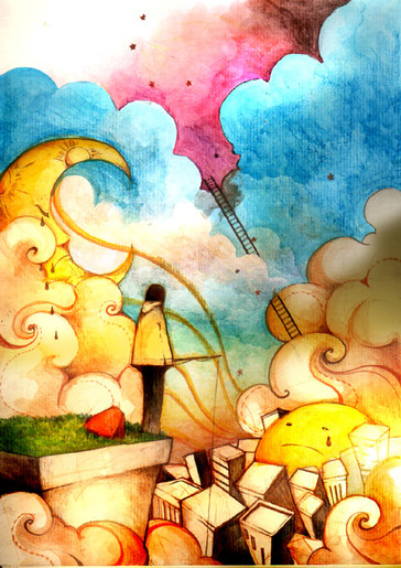 The clouds, the candles, the rain, those black gradients and shades, which make us think about a puddle... and that sketch as a background,all of these are really making your piece of art original, and awesome to watch.